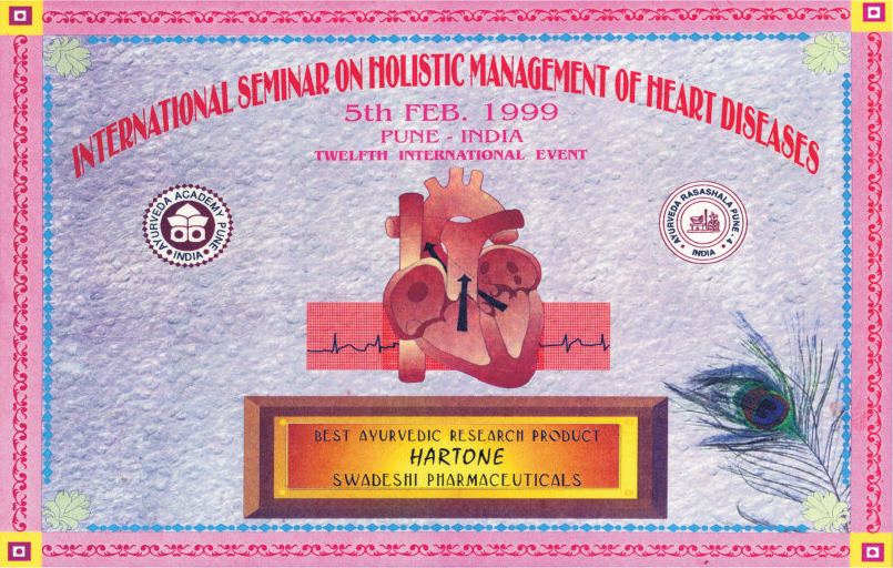Hartone, a proprietary product of Swadeshi Pharmaceuticals, was recognized as the Best Ayurvedic Research Product at the International Seminar on Holistic Management of Heart Diseases, held in Pune in 1999.